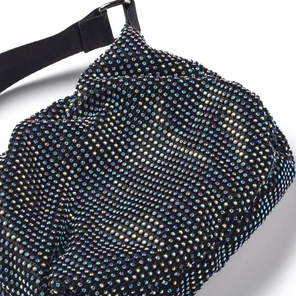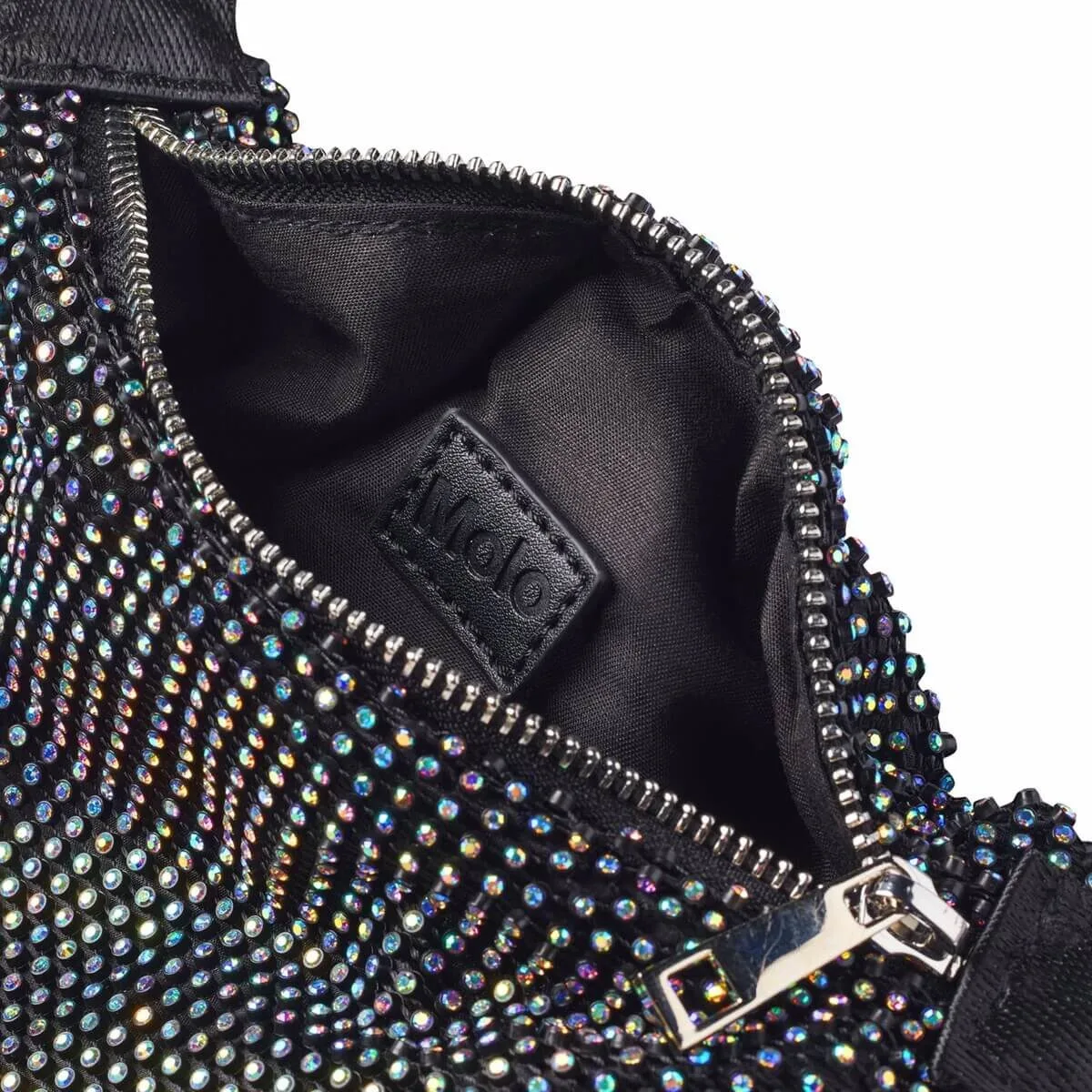 Black handbag with beautiful rhinestones and black handle. The handbag measures 18 cm in width and 13 cm in height without strap.