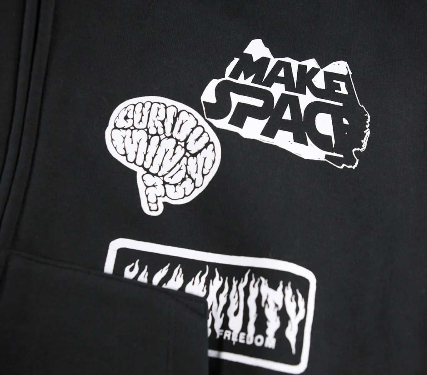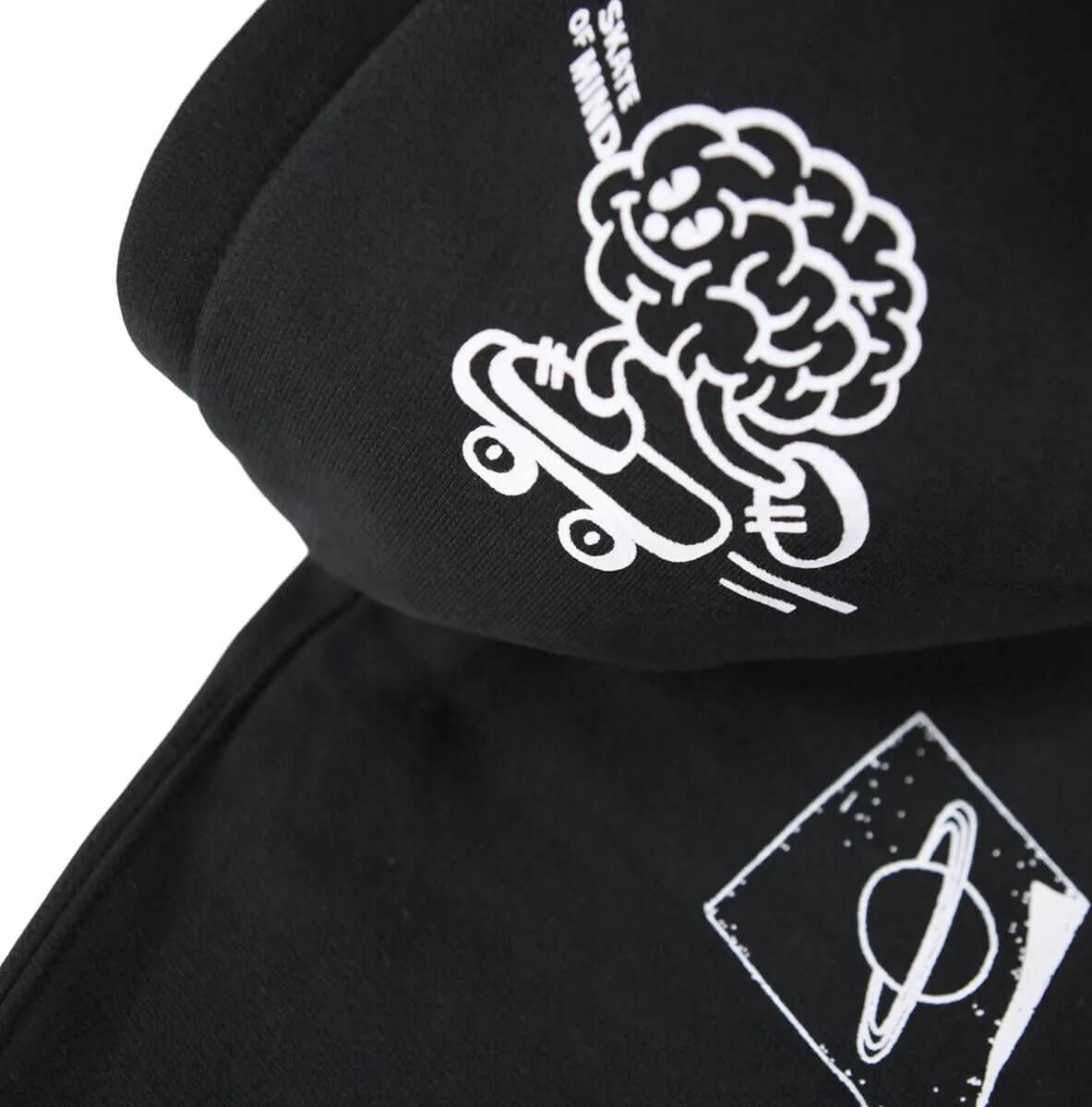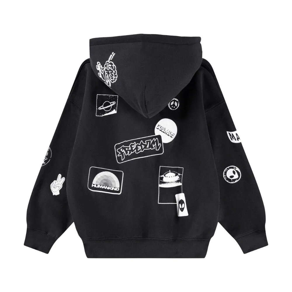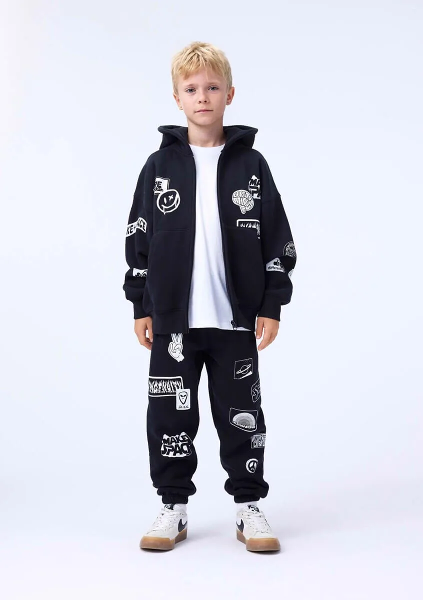 Black cotton hoodie with a kangaroo pocket, a front zipper and ribbed cuffs and hem. This hoodie has a white print of various graphic icons and text.This Molo product is STANDARD 100 by OEKO-TEX®-certified. Read more about here.