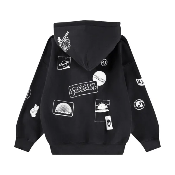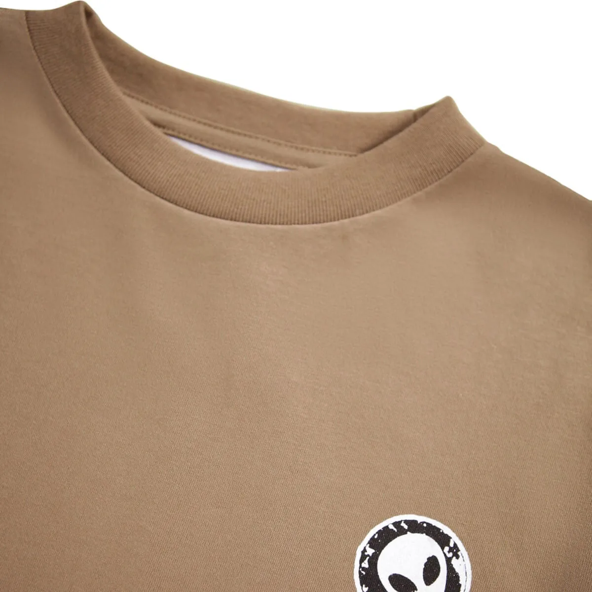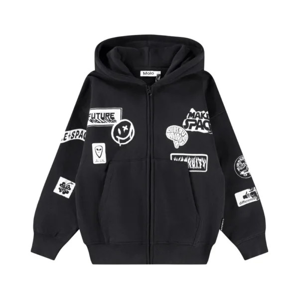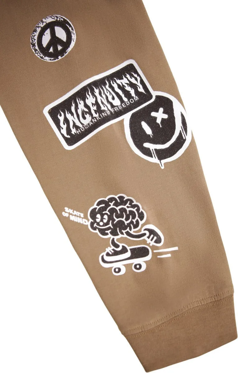 Brown long-sleeved top made of organic cotton with ribbed neckline and sleeves. The long-sleeved top has a loose fit with small black and white prints of stickers with funny and cute statements.This Molo product is GOTS Organic certified by Ecocert Greenlife, License no. 197496. Read more about the here.