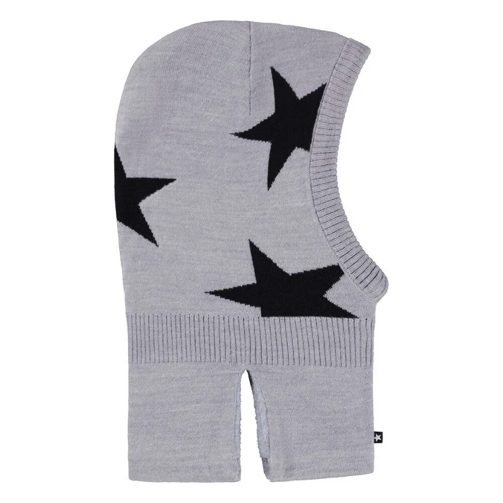 Grey balaclava with black intarsia stars. The balaclava has slits on the side of the neck so it fits well over the chest and shoulders. Made in a soft wool blend and lined with soft fleece lining.