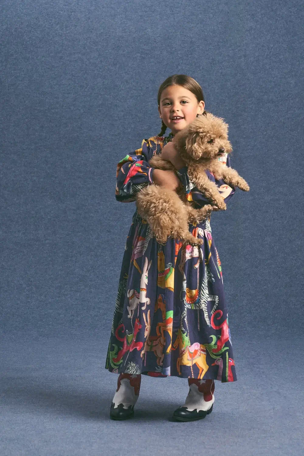 The Carnival dress in navy blue features a colorful all-over print, ruched elastic details, and puffed long sleeves.