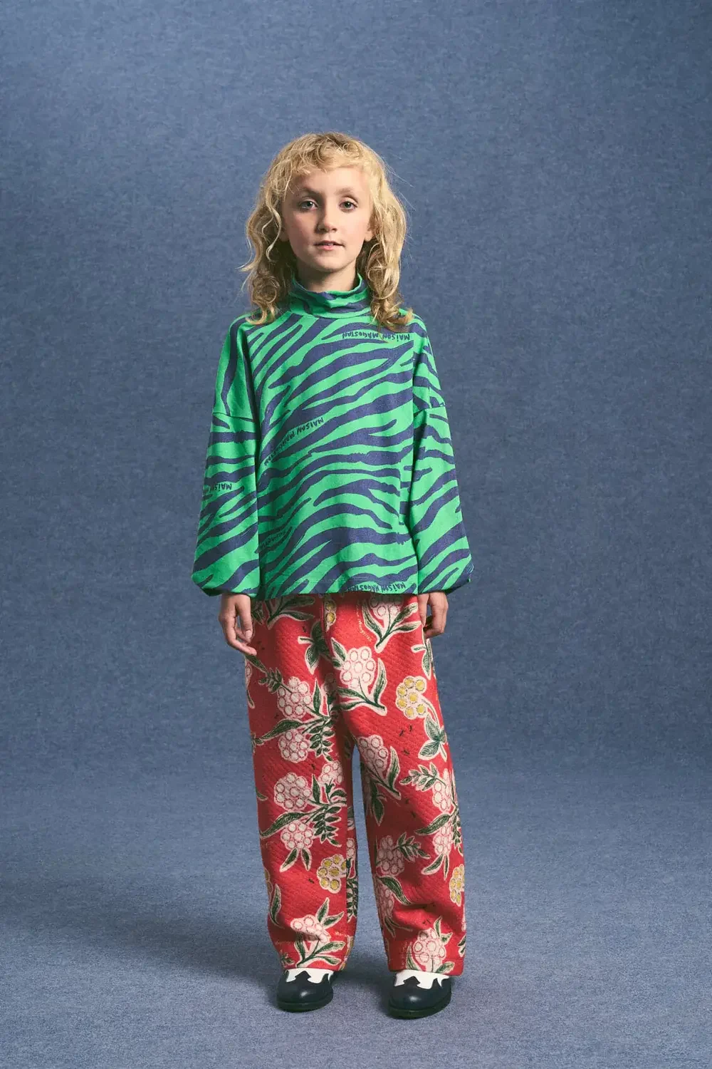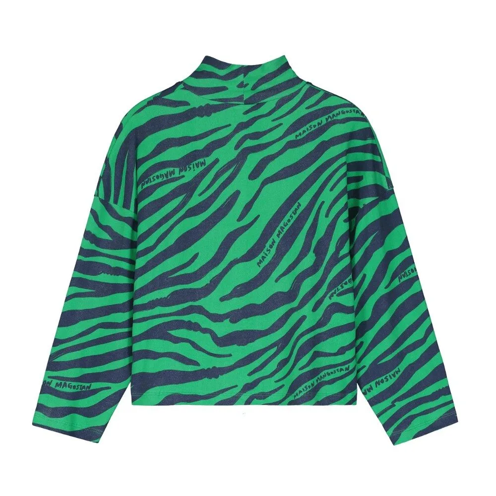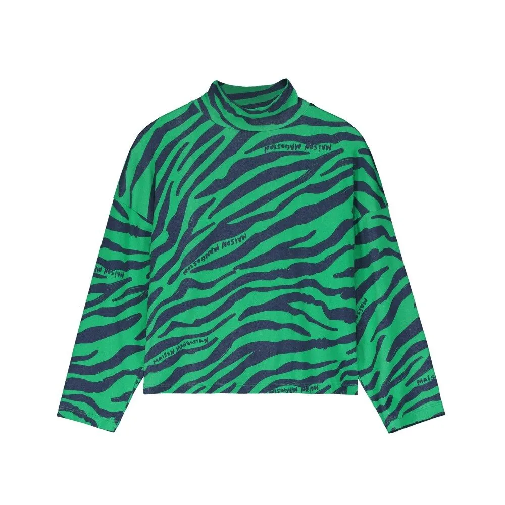 The Tiger Turtleneck T-shirt in mentha green, with a relaxed fit, features an animal print and long sleeves.