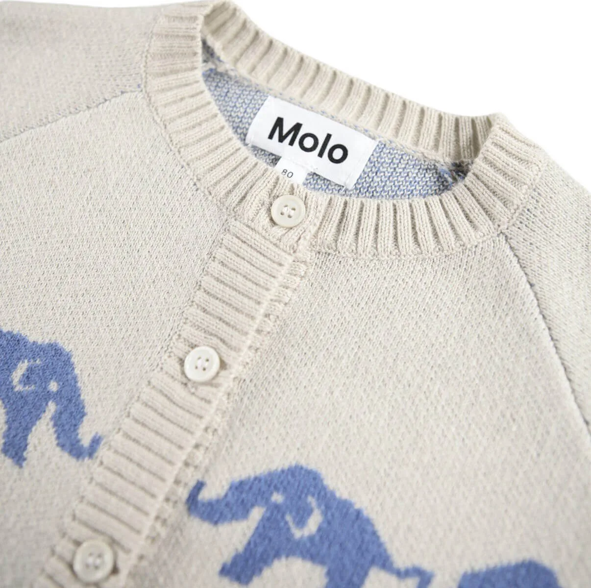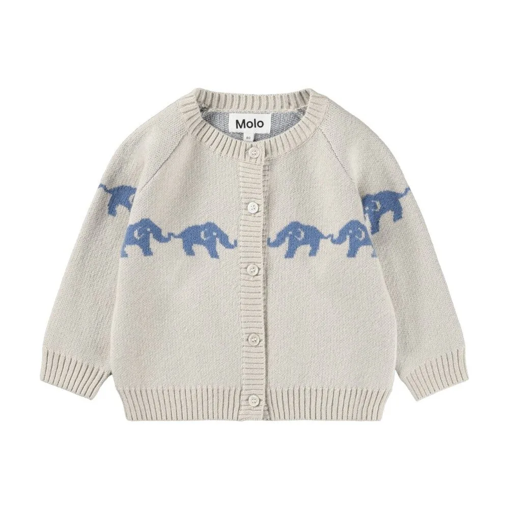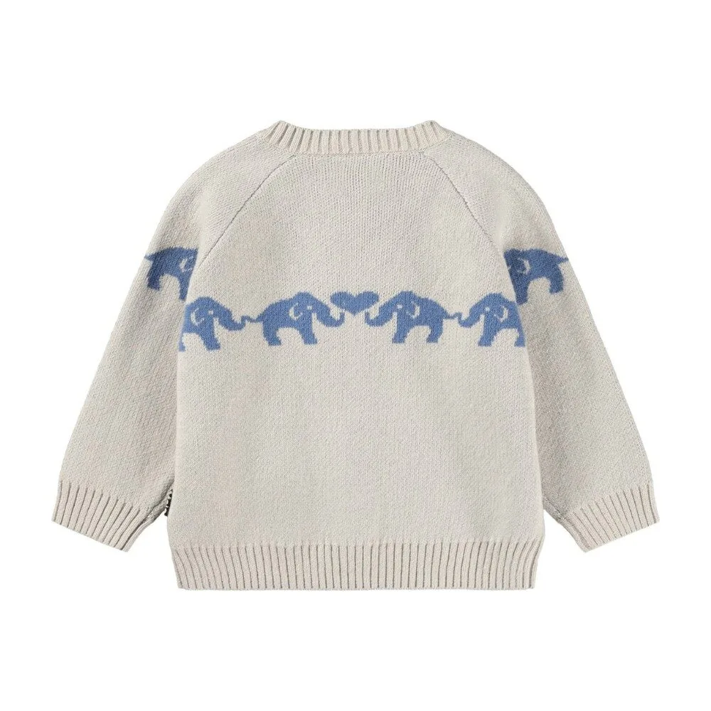 Off-white knitted cardigan for the little ones made of a soft cotton and wool blend with a border of blue elephants. The cardigan has a round neck, ribbed edges aroudn the neck, sleeves and waist and a button closure at the front.