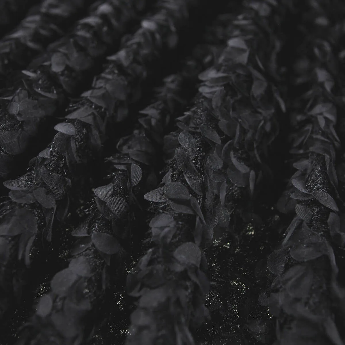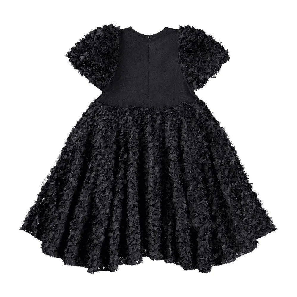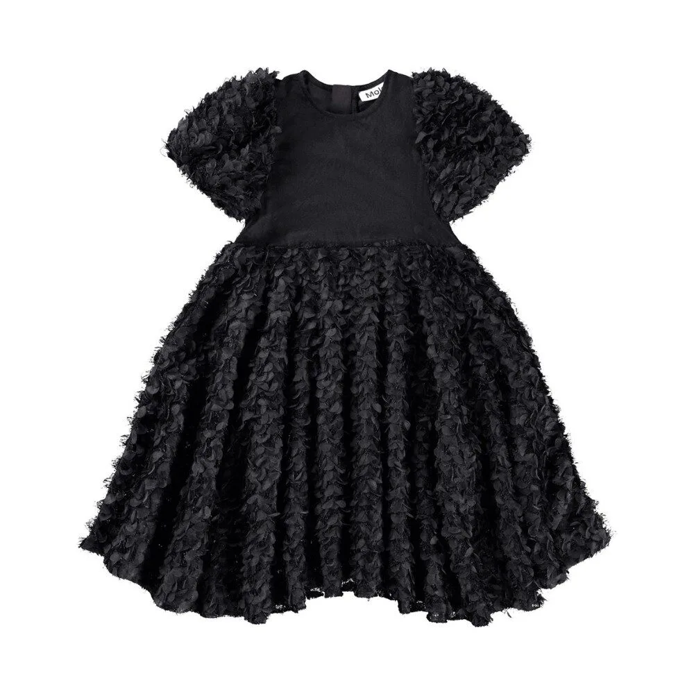 Black knee-length dress with a large skirt and puff sleeves in an oversized fit. The dress has small leaves and fringes on the sleeves and skirt, which gives a nice effect. It is easy to put on and take off with an invisible zipper on the back.