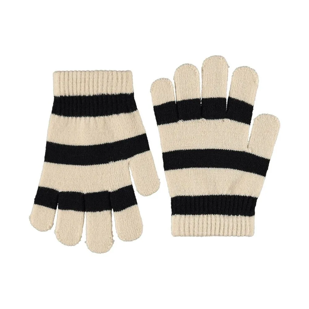 2-pack of knitted gloves. One in gray and beige and the other in black and cream-colored stripes. The gloves have a ribbed cuff around the wrist that makes them comfortable to wear and prevents them from slipping off the hand.