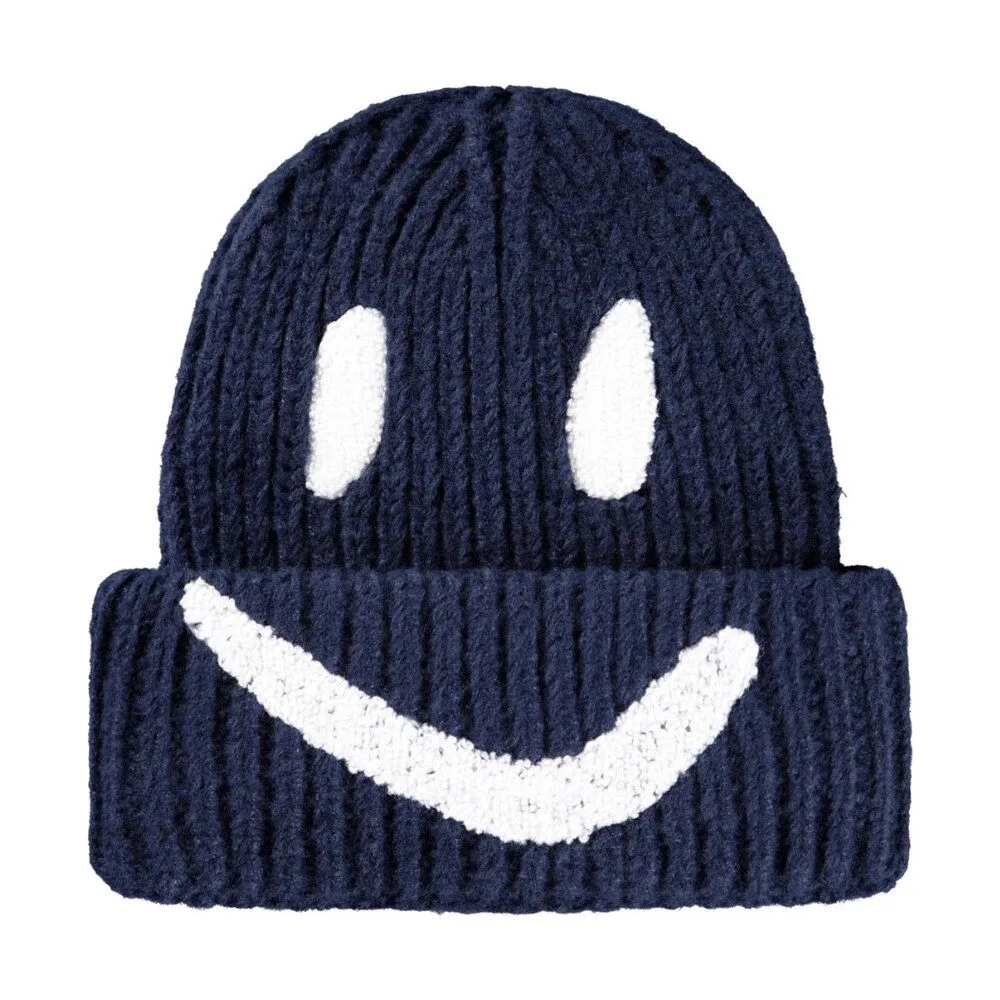 Rib-knitted beanie with roll up and embroidered smile in black.