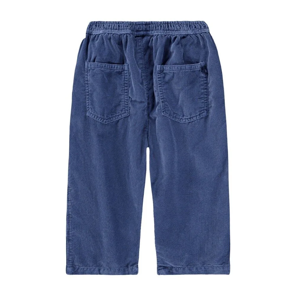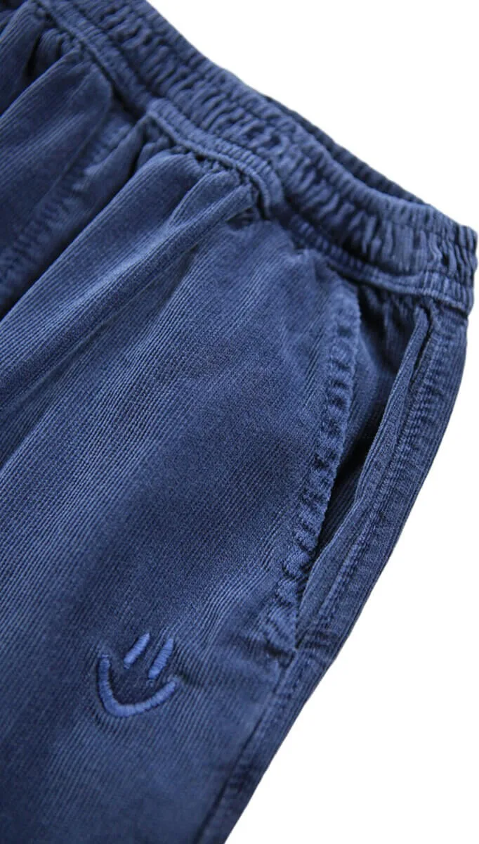 Blue corduroy pants for the little ones made of organic cotton. The pants have a loose fit with front and back pockets and an elastic waist that makes them easy to put on and take off. The light and airy design ensures plenty of space to move and at the pocket you will find a small embroidered smiling face. Combine the pants with the matching sweatshirt to get a complete and comfortable set.This Molo product is GOTS Organic certified by Ecocert Greenlife, License no. 197496. Read more about the  here.